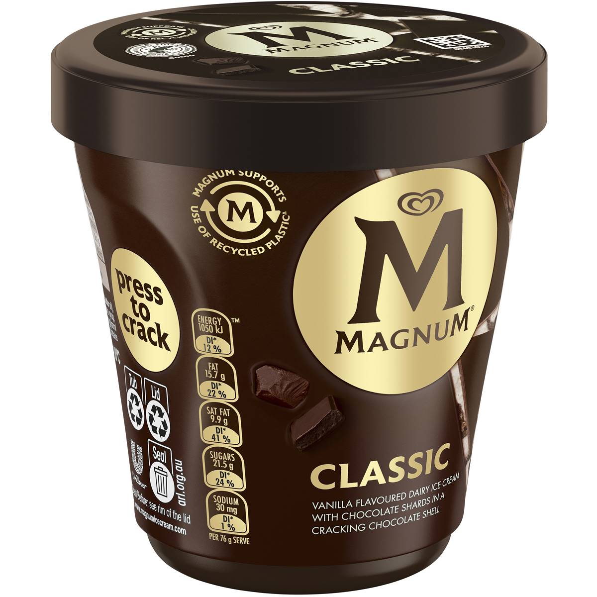 440ml Magnum Classic Tub$13.95Experience Magnum Classic in a tub. Made to be broken. Discover the ultimate Magnum cracking chocolate and velvety ice cream experience with the new Magnum Classic tub. Squeeze the pack and crack the thick Magnum chocolate shell that envelops the delicious velvety vanilla flavoured ice cream.Out of stock